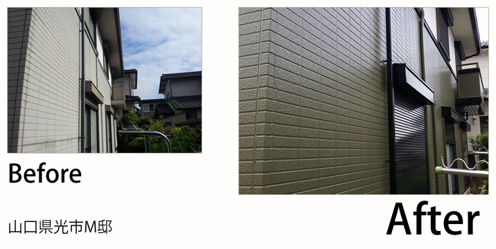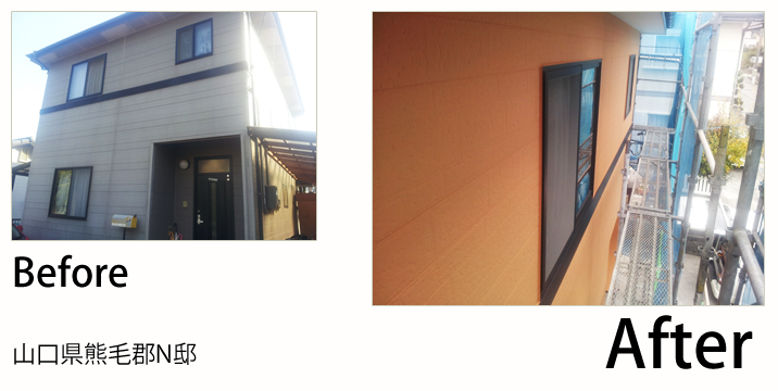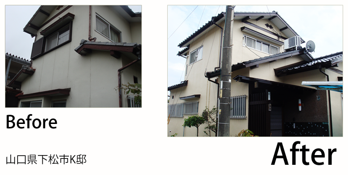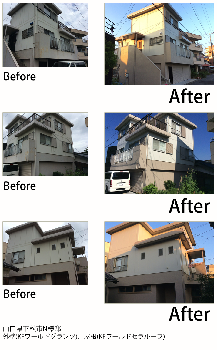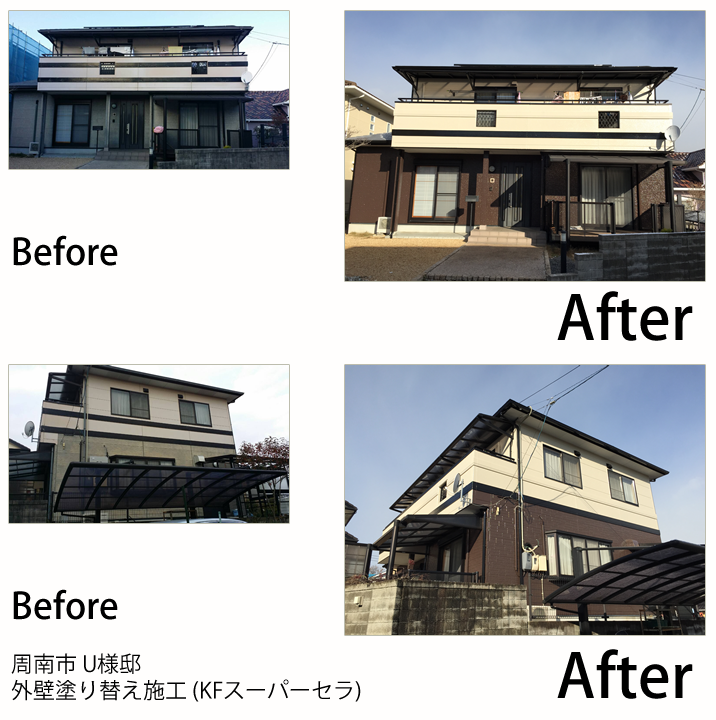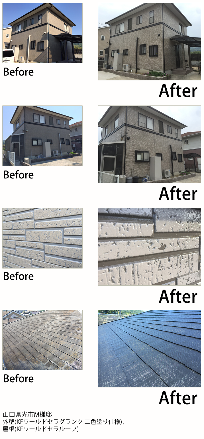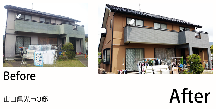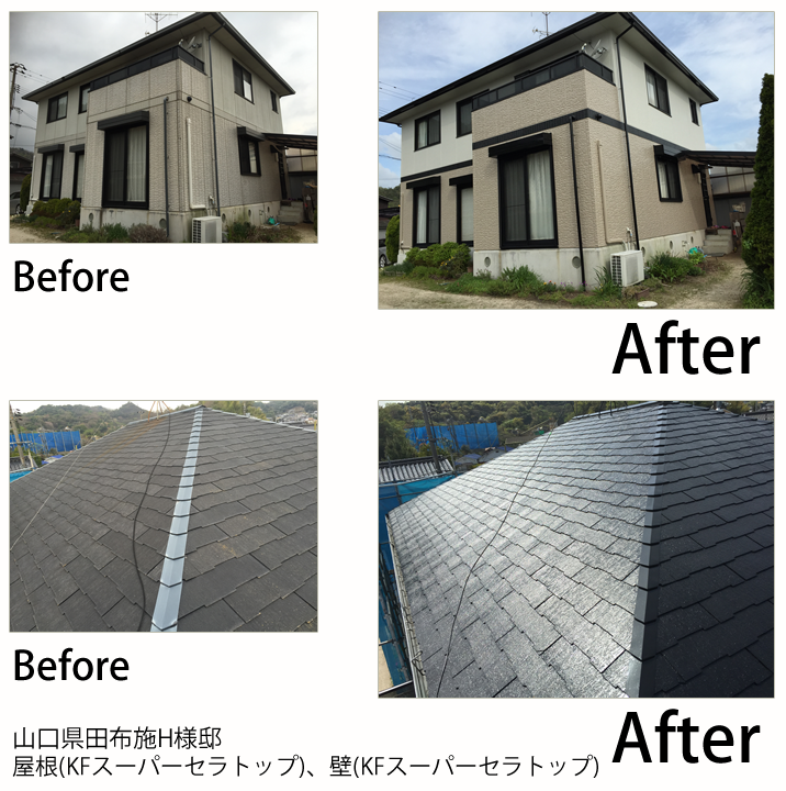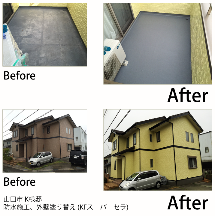 - 山口市の山手の方にお自宅があるので、冬の寒さ対策でガイナをお勧めしたのですが、KFスーパーセラトップの耐久性に惹かれて、決められました。色を明るくしたいと言うことで黄色目の強いクリーム系チョイスさせました。帯やサッシなどの黒色と相性が良く、バランスよく仕上がりました。ベランダのFRP防水も痛んでいましたので同時に施工させて頂きました。新築になったみたい!とお客様にもお褒めの言葉を頂きました。これからも宜しくお願いします。