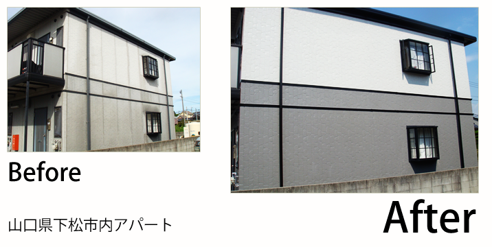 - 色はグレーをベースにサッシや帯、パラペットなどのバランスを見て、濃いグレーと薄いグレーのツートンにしました。同系色のツートンは無難でバランスがよく、失敗はありませんね。アパートの場合は、色々なお客様が住んでおられるので、あまりダラダラと工期はかけれません!佐伯塗装では、臭いのあまりなく、環境にいい塗料や、乾きの早い塗料などを選択して、住人様に迷惑をかけず、出来るだけ素早く、いい仕事が出来るように心がけています。大家様にご迷惑をかけないように最高の仕事を提案します。