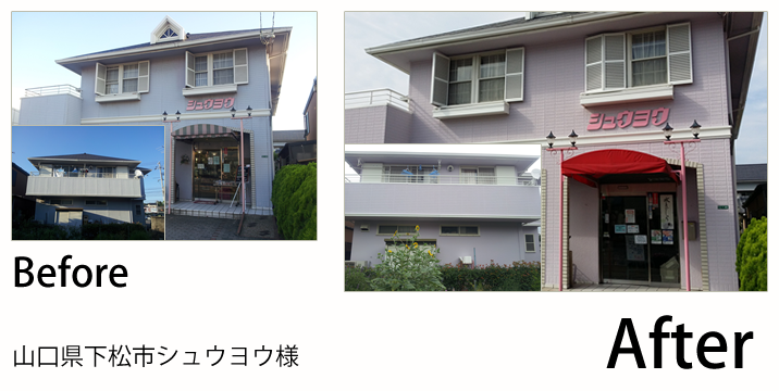 - 10年前に佐伯塗装で仕事をさせてもらったお客様で、今回もご依頼頂きました。ありがとうございます。ケーキやお菓子を作る材料を販売しておられるお店で、そのイメージにあった色合いと言うご依頼でしたので、お客様と考えて明るいラベンダー色に決まりました。 樋や帯の白色と相性がよく、いい感じに仕上がりました。玄関のテントも痛んでいたので、新設して、赤色でワンポイントをつけ、お店を引き立てました。全体的にバランスがよく仕上がり、お客様にも喜んで頂きました。