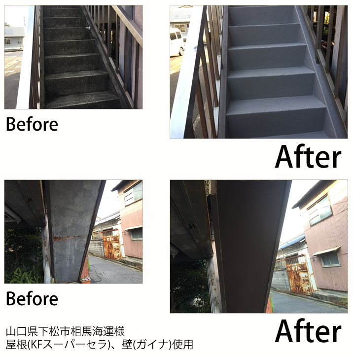 - 知り合いからのご紹介でご依頼頂きました。階段モルタル部分の防水塗装と階段下の鉄板をの塗装をしました。海が近いのでよく錆びていましたが、しっかりとケレンをして錆止めを2回塗りして、上塗りはシリコン2回塗り塗装をしました。防水は耐久性のいいウレタンゴム系の防水塗料を使用しました。階段は滑ったら危ないので骨材を入れて滑りにくくして安全性も高めました。綺麗になったとお客様も喜んでおられました。ありがとうございました。