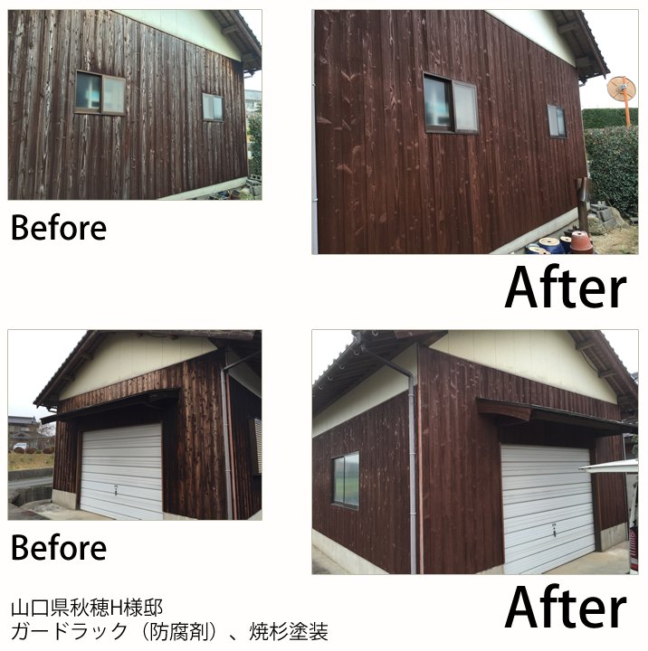 - 知り合いのご紹介で焼杉の塗装を依頼頂きました。結構痛みが激しかったので、耐久性と隠ぺい性に優れている、水性のガードラックアクアで塗装しました。水性で臭いもあまりないので、団地などの密集地での作業にはオススメな塗料です。本来なら一回塗り仕上げの塗料なんですが、今回は痛みが激しかったので二回塗りしました。いい色に仕上がりお客様にも喜んで貰えました。