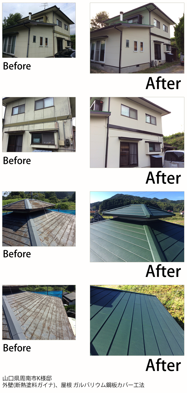 断熱塗料ガイナに興味を持たれておられ、ガイナで経験豊富な当社を選んで頂きました。屋根はかなり劣化していましたので、ガイバリウム鋼板を使用してカバー工法で施工させて頂きました。廃材も出ないのエコな工法です。お客様に夏場のガイナの効果も感じて頂き大変満足して頂きました。
