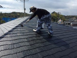 田布施町H様邸、無機塗料KFスーパーセラトップ屋根上塗り作業