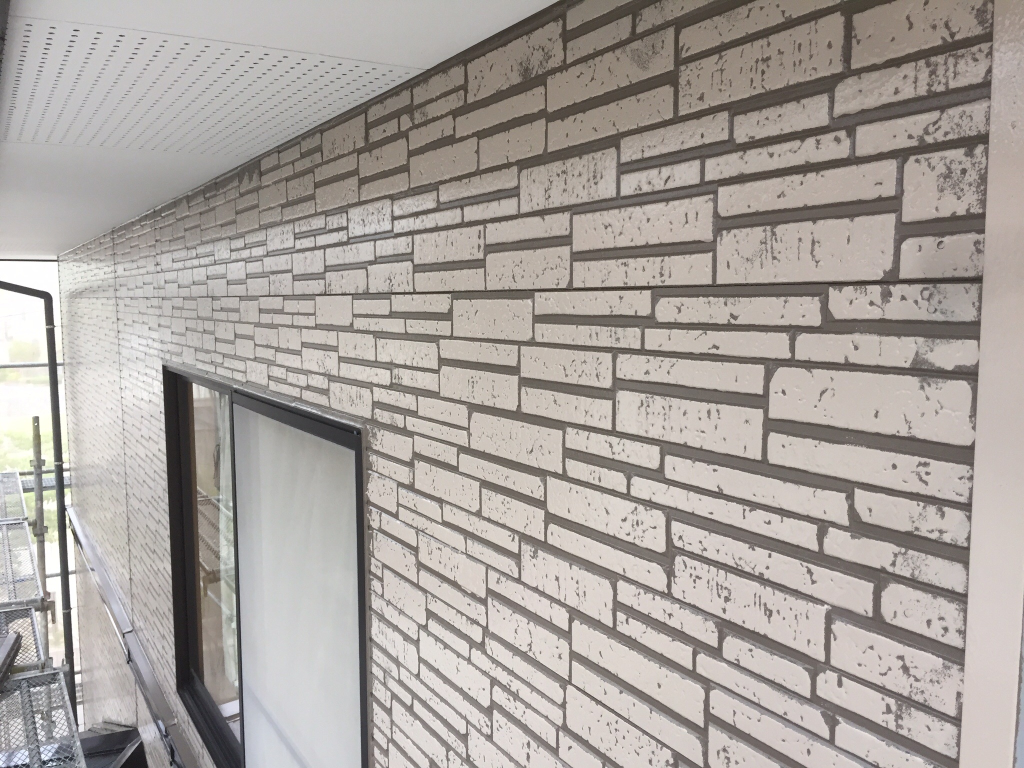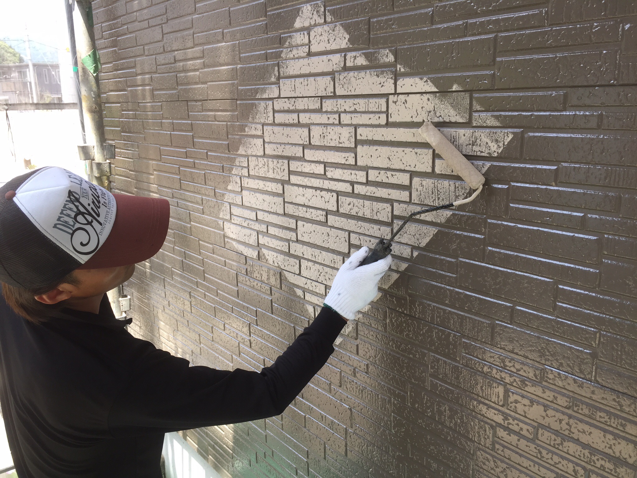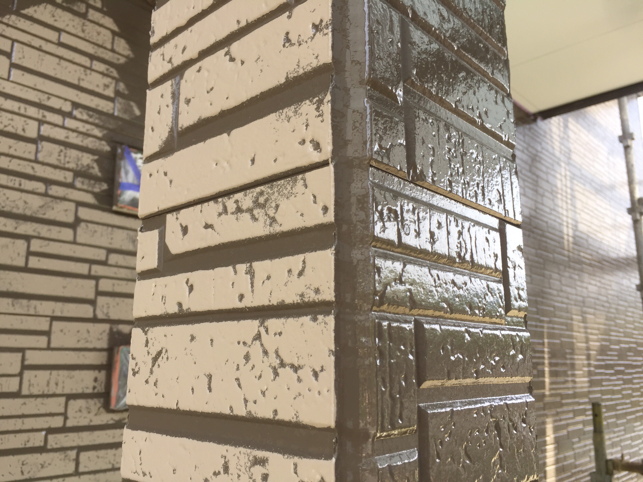 これがまた大変な作業で始めにベースになる目地の濃い色で外壁全体を塗装して、最後に仕上げの薄い色で目地やクレーターなどを塗り潰さない用に、4㎜の短毛ローラーを使ってゆっくりと塗装していきます。