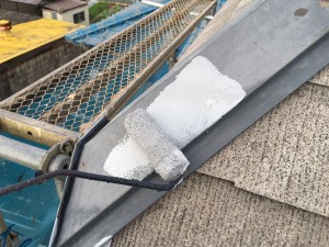 無機塗料の下塗り材KFハイブリッドルーフプライマーを塗装して行きます。