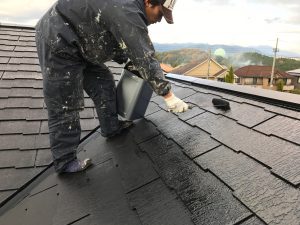屋根は無機塗料KFワールドセラルーフで中塗り作業をしました。
