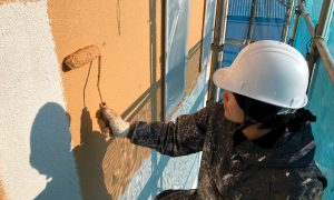今日の下松市K様邸の塗装作業は外壁の中塗り作業を行いました。