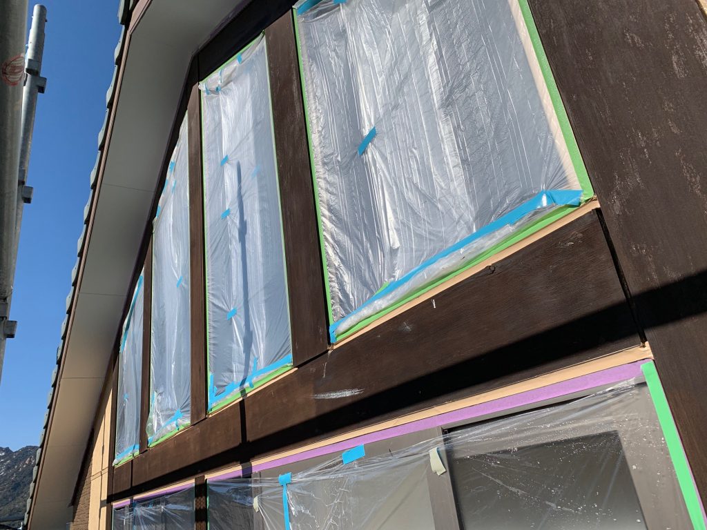 外壁の無機塗装に合わせて、樋や破風板も無機塗装で仕上げます。