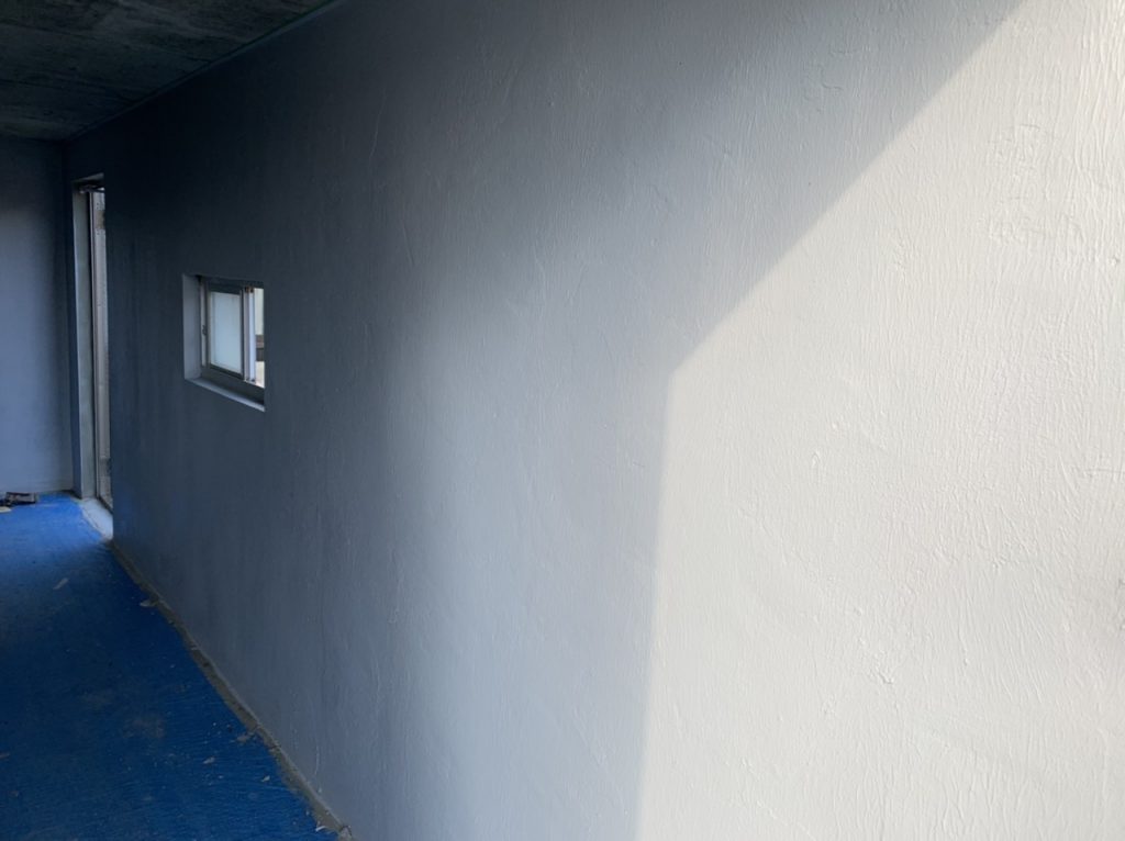 同じ現場で駐車場の内壁が下塗りで途中だったので、IPヨウヘキコートを使用して中塗り作業を行いました。