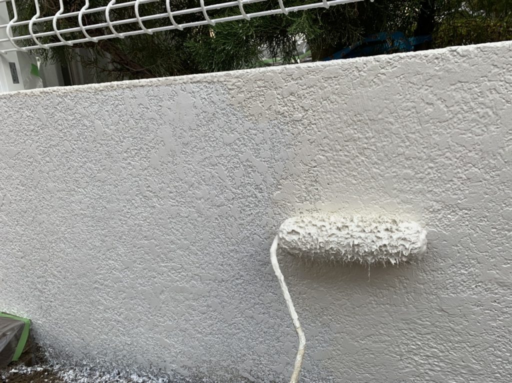 今日は朝一、昨日吹き付けをした現場の上塗り作業を行ないました。