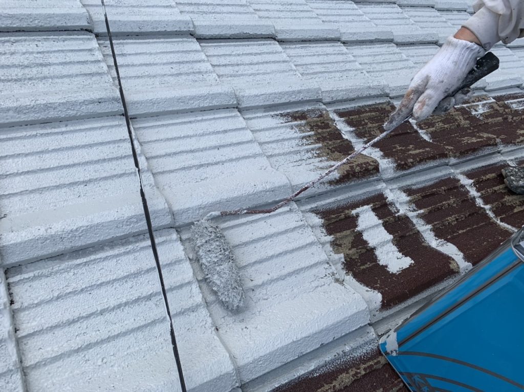 アレスルーフフィラーでセメント瓦屋根の下塗り作業。