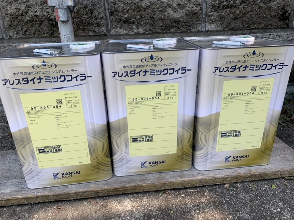 光市F様邸アレスダイナミックフィラーで下塗り作業。