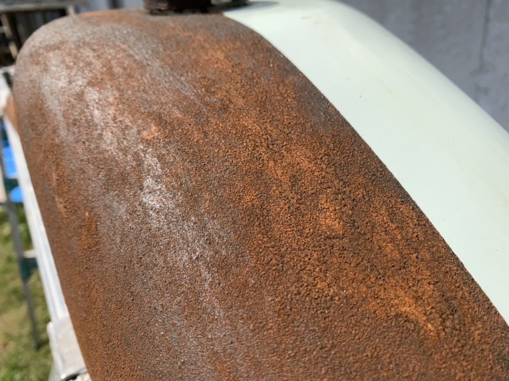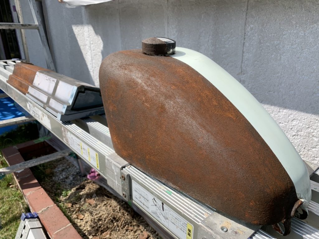 現場の休憩の合間にイタリアの特殊塗料オキシデコールラストでバイクのタンクをサビサビにしてみました!😁