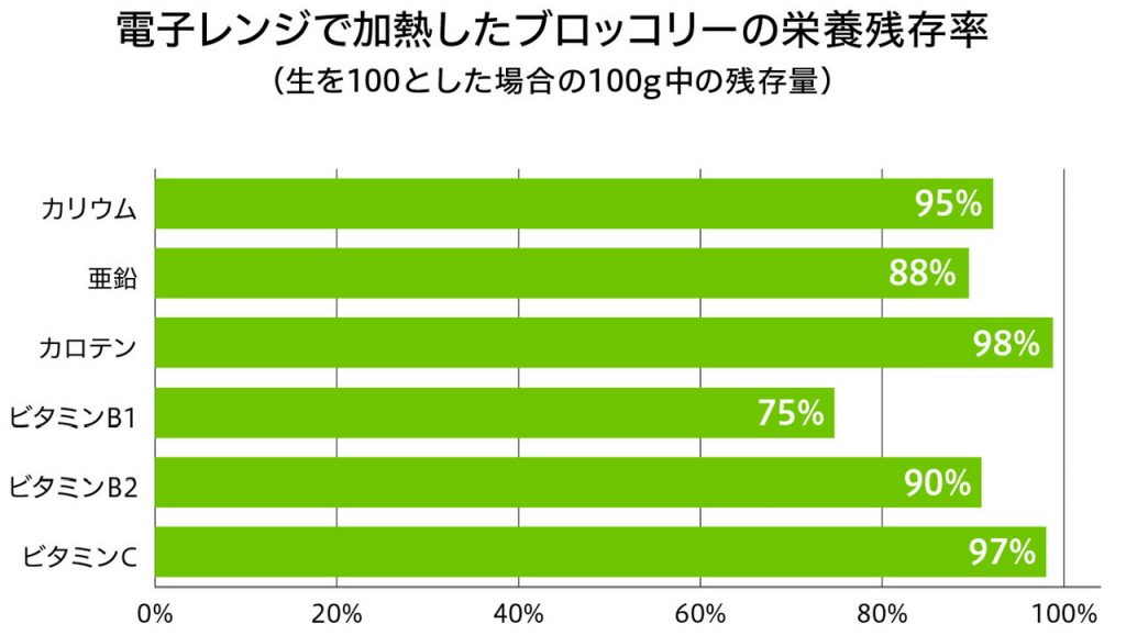 電子レンジで加熱したブロッコリーは、蒸し焼きと同様にミネラル類とビタミン類が多く残ります。特にビタミンCは97%と、蒸し焼きを上回りました。電子レンジでの加熱も、栄養の変化が少ない調理法といえます。