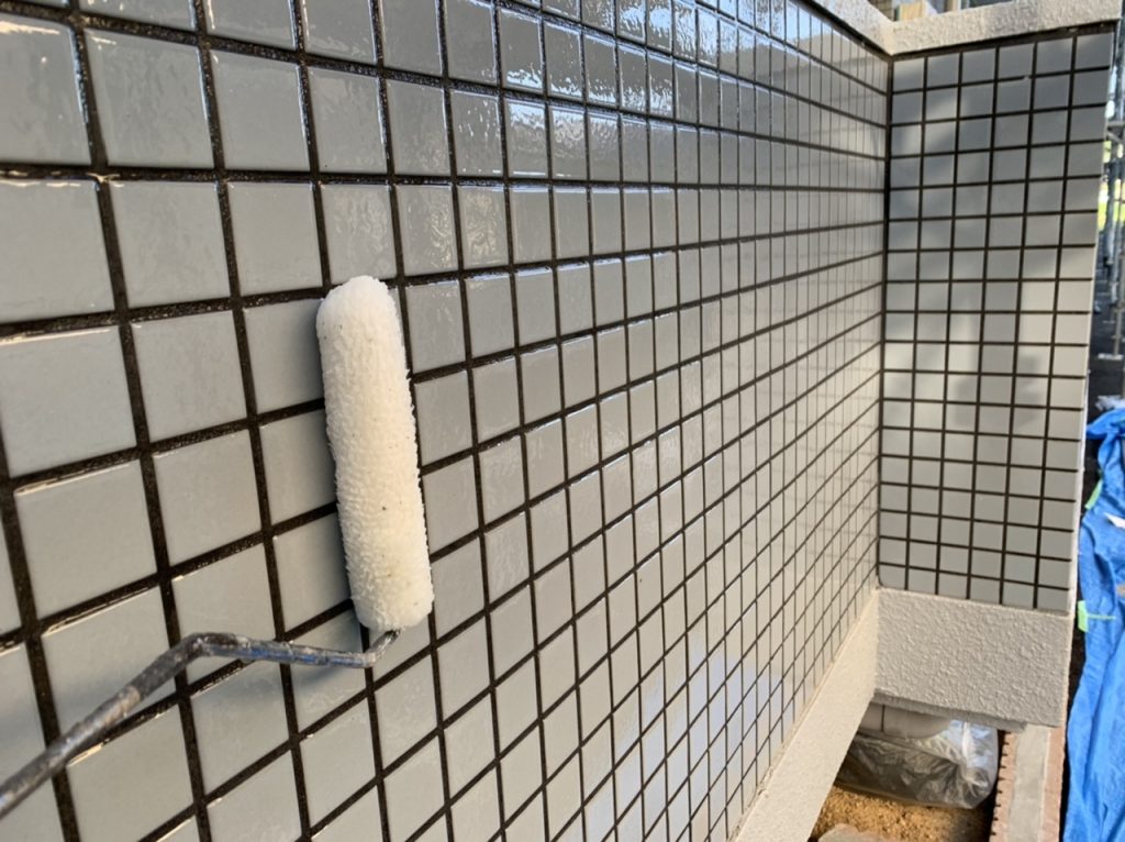 入居されているお客様が早く洗濯物を干せる様に、ベランダ面から作業を先行しています。タイル面は日本ペイントさんのファイングラッシィS iクリヤーを使用して塗装しています。